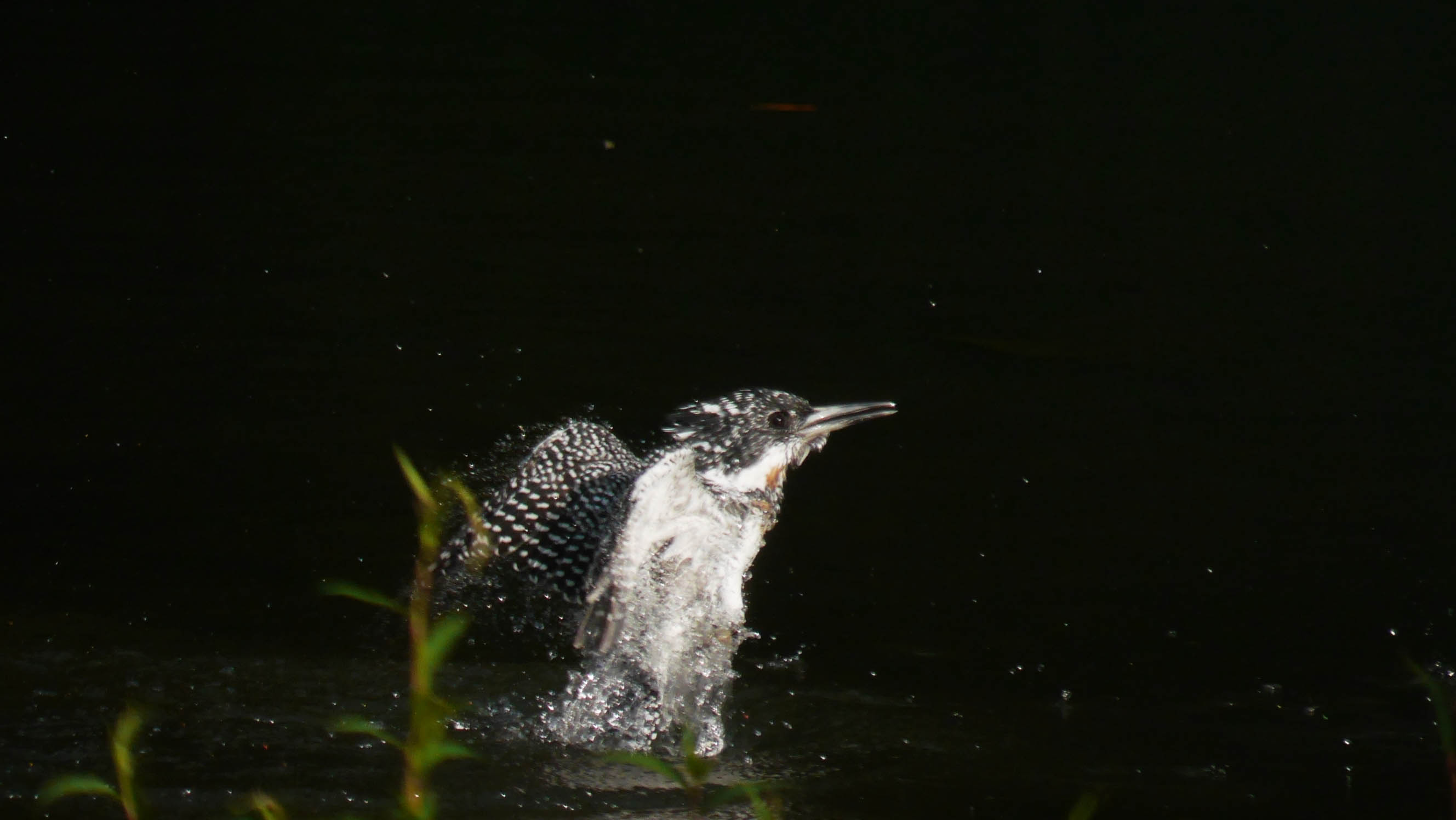 直ぐに飛び込んだものの、水音がしません。咥えて上がって来たのはカエルでした。かなりの大型だったので、止まり木に何度も打ちつけてから呑み込みます。