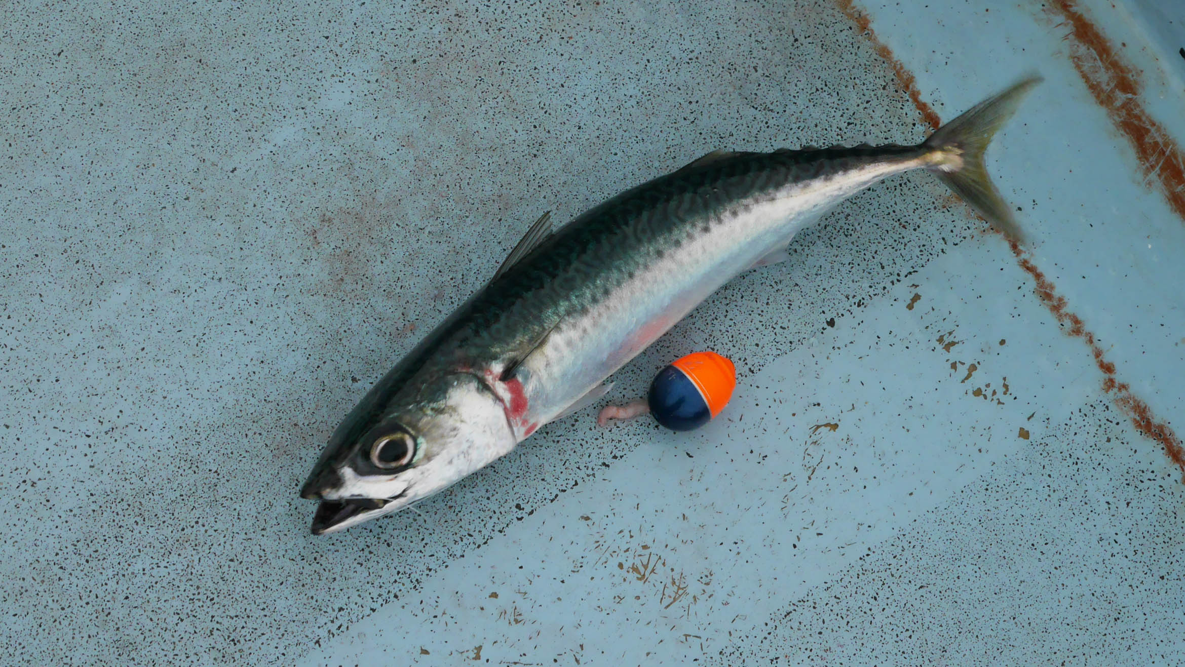サバが釣れたのは16時頃。白エビのムキミを付けて20m位沈んだ時に一回目のアタリ、23mくらい沈んだ時に竿引きのアタリで、マダイと思って合わせたのですが、見事に裏切られてサバが釣れてしまったのです。