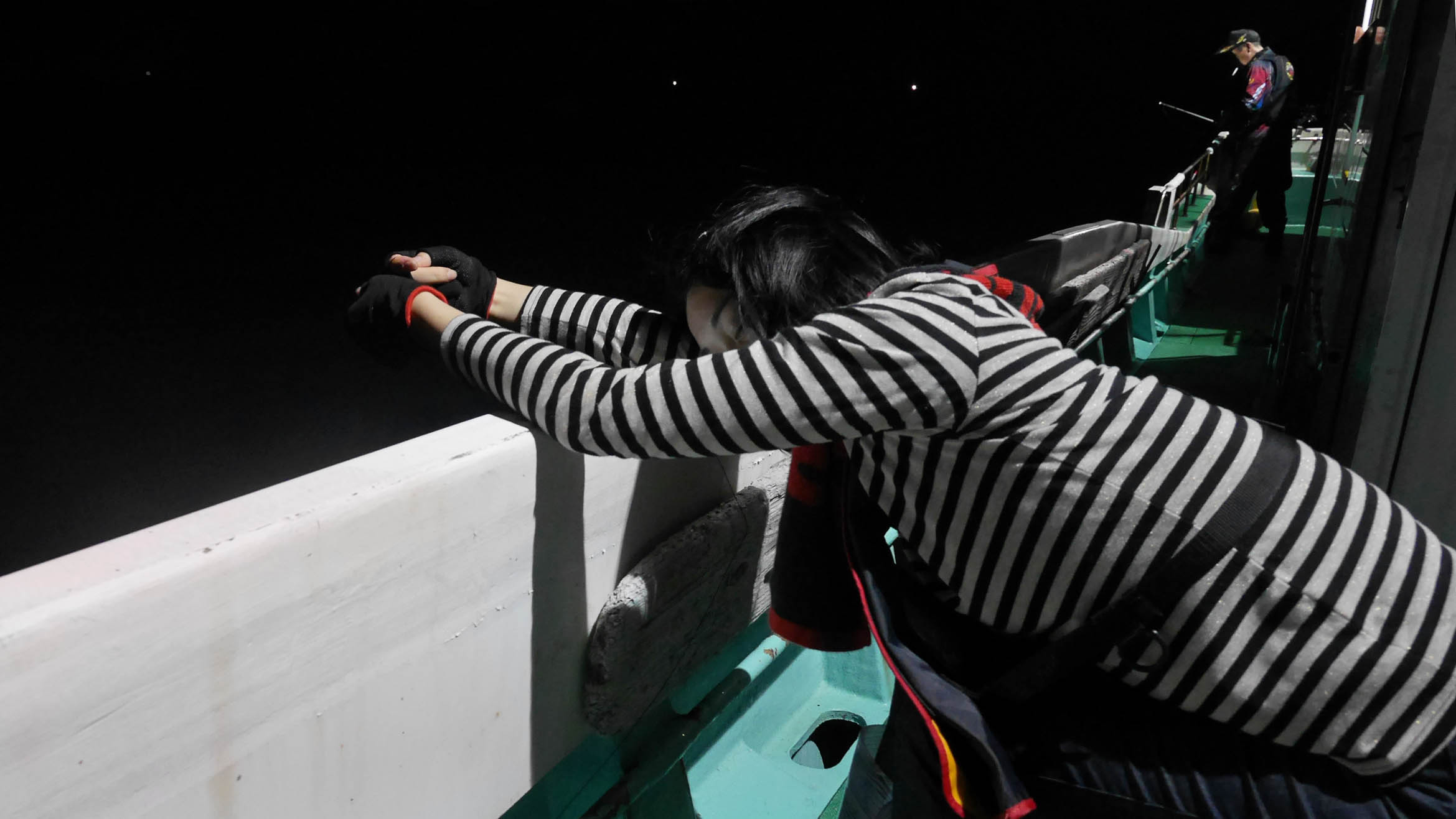 YY女子部の常連の約2名は、一杯も釣らずに脱落。ず~~~~っと操舵室後方のキャビンで寝ていました。進栄丸は渡船なのでトイレと外のキャビン・中のキャビンを使えます。船は幅が広いので、8名くらいは同時に釣れるから有難い。