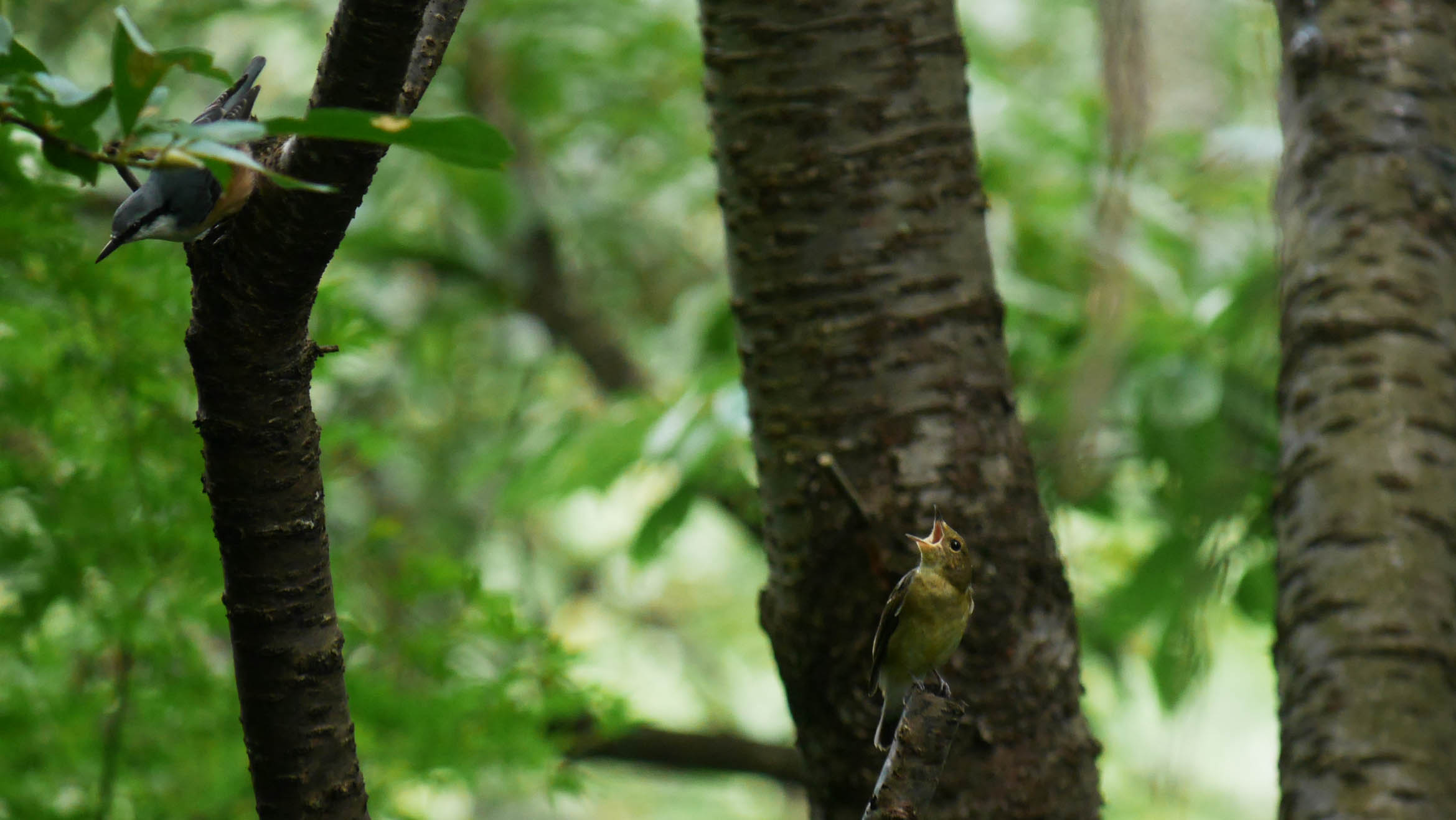 威嚇するキビタキに、たじたじのゴジュウカラ