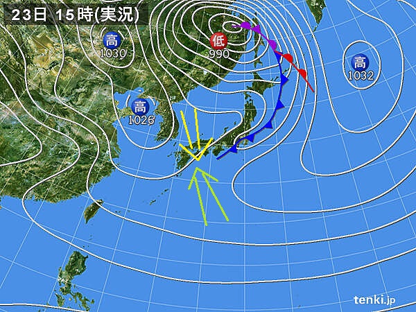 15時の実況天気図を添付していますが、22日は南からのウネリが大きくなり、大分県などは春一番が吹きました。そのウネリは続き、23日の5時頃から北西風が強まり、ウネリは収まる方向ですが、選手は終日北西風に晒されました。