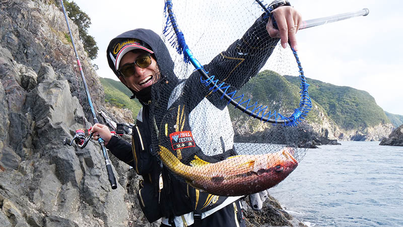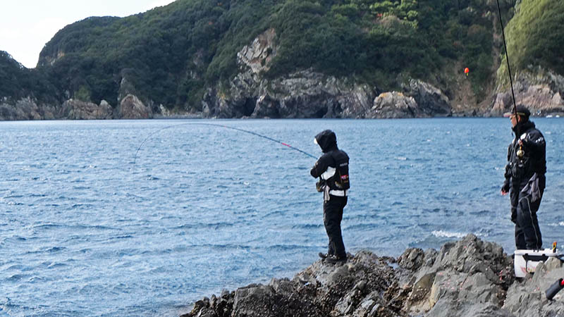 2日はGFG杯の選手やオブザーバーを磯へ案内後は、若手スタッフとの約束で“押し出のサザエ”に上礁。朝陽との竿曲げシーンを狙うと、魚を掛けて竿を曲げたのは城本君。色んな行事で大変だろうに、期待通りしっかりと釣ってくれる。