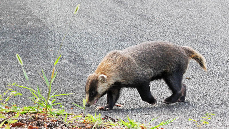 県民の森入り口が道路工事の間には通行止め。迂回していると二人の鳥見仲間に出会った。話を聞くと、「ヤマカガシが獲物を呑んで傍に居て、石を投げて追い払おうとしても逃げなくて、頭を隠しているから諦めてこちらが退散した」