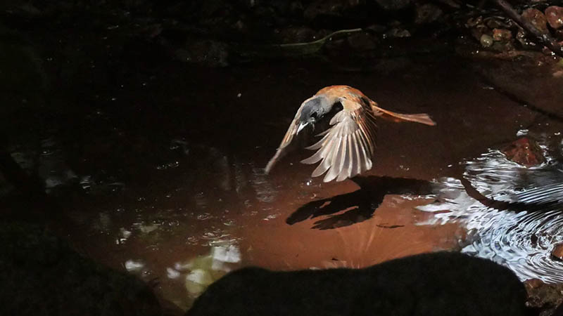サンコウチョウの水浴びは、空中から溜り水にダイビングして行います。