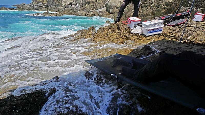 しかしながら台風3号の置き土産であるウネリは、シートを張って休んでいた私達の足元まで洗ったり、そこら辺の磯回りを搔きまわしたり、波が収まらなければ釣りとしては厳しい状況が続きました。