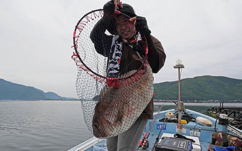 丸二水産の伝馬船を操船して4人で湾内生簀のマダイ狙い。その一投目に友人の奥さんが仕留めたのは4.5㎏の立派なマダイ。これまでは30㎝位までの魚釣りをしていて、初挑戦のカセふかせマダイで記録になる大型に大興奮です。