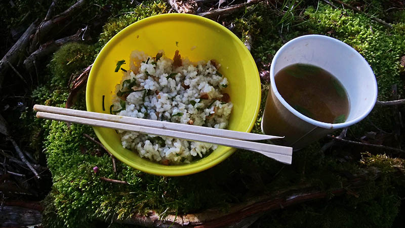 “天狗分れ”が私たちのビバーク地で、テントの設営やら食料の調達。他のグループはトラブルで、レスキュー隊と一緒に下山していました。夕食は料理自慢のタカさん作の、美味しいコシアブラ飯と味噌汁を頂いて20時30分に就寝。