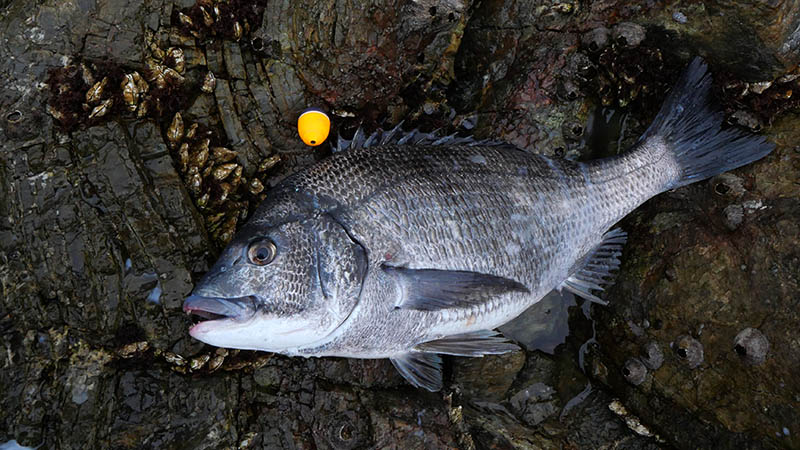 最初の1時間20分はマキエを効かせるため、普通のクロ釣り仕掛けて魚を狙うと、30弱のクロ2枚をリリース、次はは1.5㎏弱のクロが釣れて更にチヌ。磯近くを狙ってもイシダイのアタリは出ず、ウマズラハギやカワハギなど。