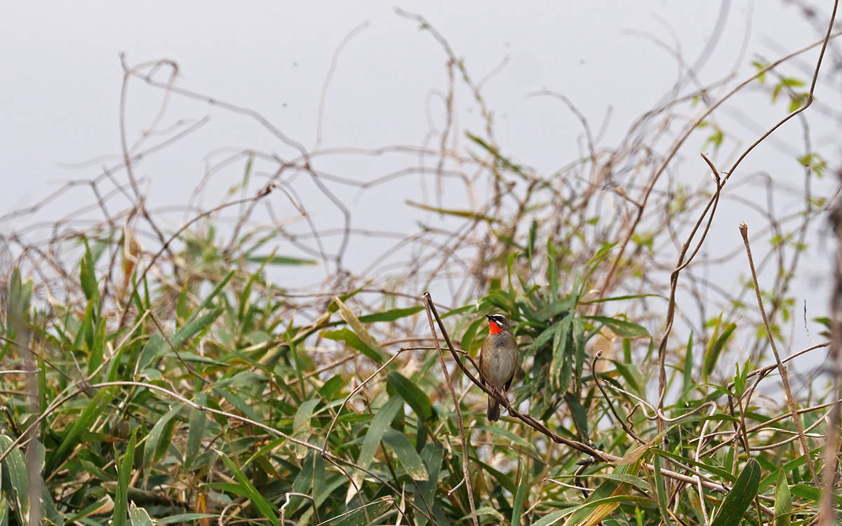 車外に降りて藪を見渡していると、10m先で鳴くノゴマを発見。