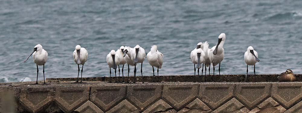 15羽のクロツラヘラサギと右を向いたヘラサギ1羽