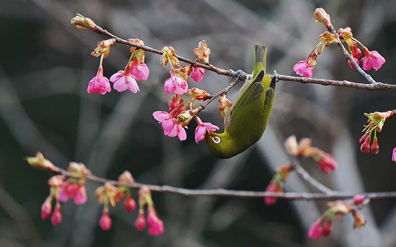 大分市内の県民の森にある一本の河津桜も、数日前から一分咲き。