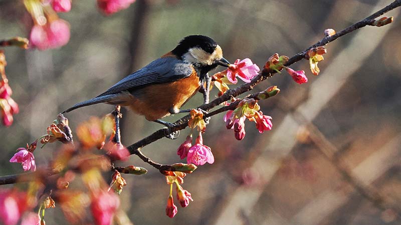 今年は咲き始めからヤマガラちゃんが数羽で来ています。