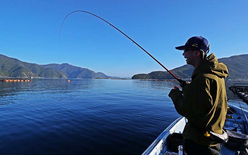 中央の生簀へ移動しての一発目を曲げる隈井君