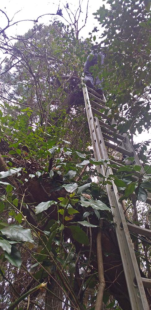 やむなく、木々の上の方で葉や枝に引っ掛かっている実を収穫した。