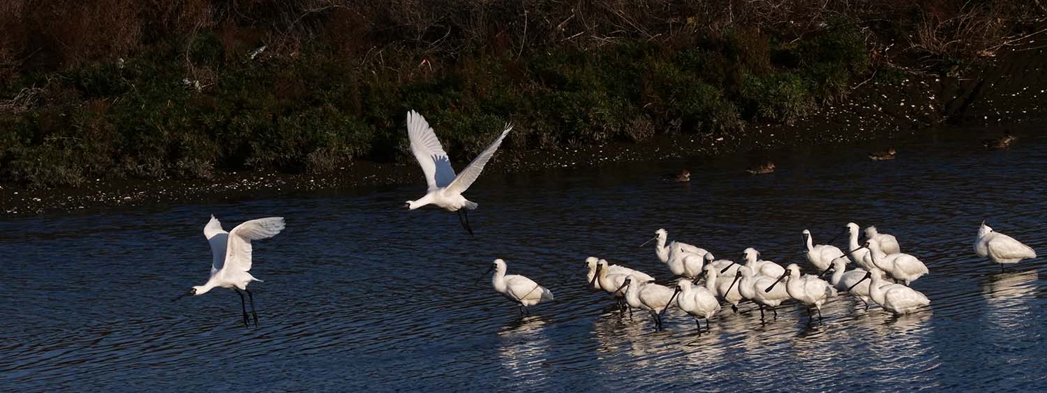 中津で河口を覗くとクロツラヘラサギが6羽、更に増えて22羽ほどに。
