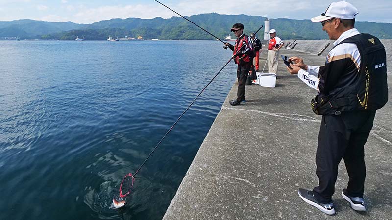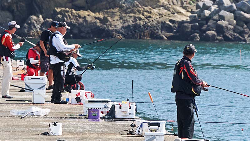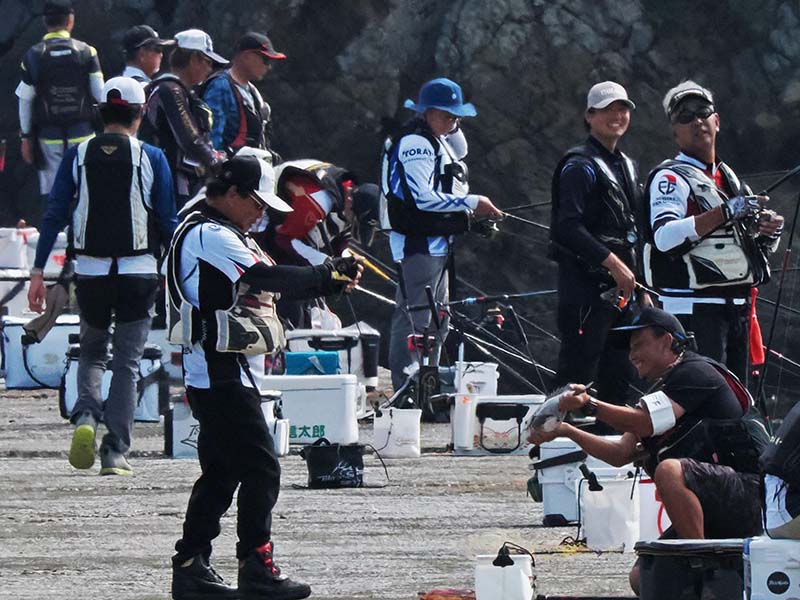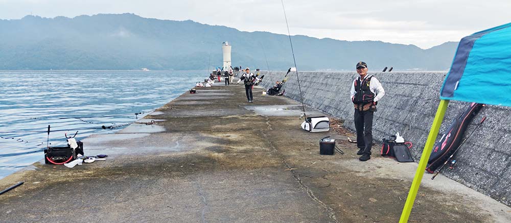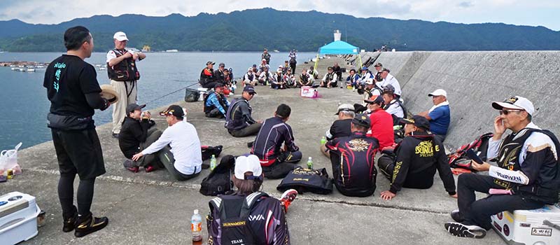 開会式の最初に黙祷を捧げ、全員が千怒崎一文字へと上礁し、7時15分の開始の合図と共に釣り始め、11時の昼食休憩に懇親を深め、12時から14時迄が後半の釣りで大会は終了です。