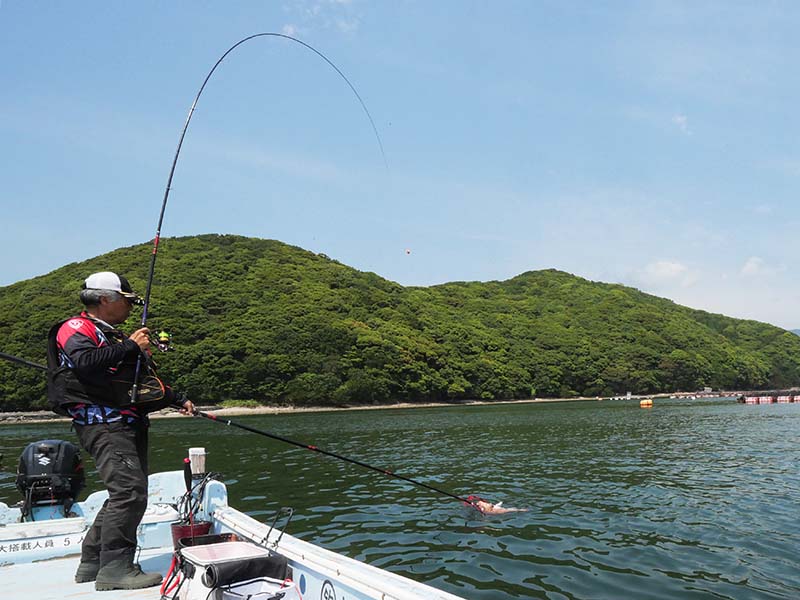 蒲江の丸二水産で借りた伝馬船で、湾内の生簀周りをカセ釣りです。