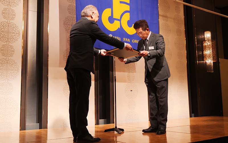 会場のANAクラウンプラザホテル福岡で、2023年の表彰者として来場した5名一人一人に表彰状と記念品の授与。続いて記念の撮影は今回の表彰者と、コロナで2年開催していなかった受賞者たちで、今回来て頂いた方々との記念撮影。