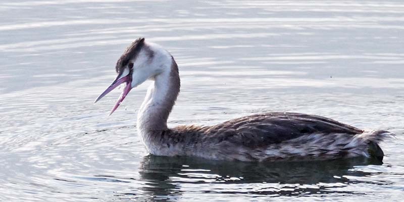 カイツブリやウの食事は、加え直した後に上を向いて獲物を口中へ入れる。