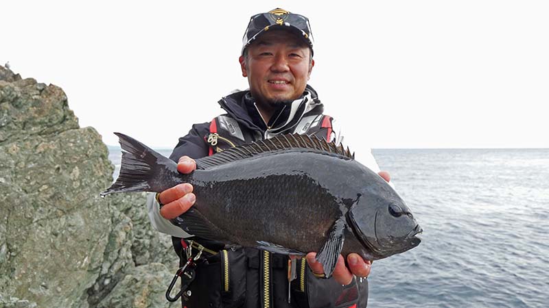 7時過ぎの夜明けまで、高橋君はキロオーバーのクロを1枚ゲット、私は5匹のカサゴだけで夜釣りは終了。私だけ昼釣り仕掛けに変え、③から竿を出すと一投目から30㎝級のクロが簡単に釣れます。でも釣り座が狭い事・小型が多い事から7時45分に納竿。8時40分の見回り船で小野山さん達の居る所に瀬替わりです。