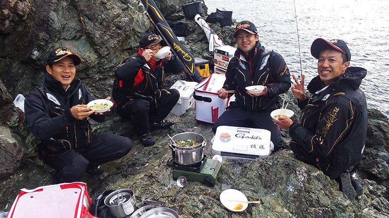 イカ釣りと青年部の取材を兼ねた私はクジを免除してもらい、イカの釣れそうな広い磯で会員たちに交じって瀬上がりで、場所は“イワシバエ”になりました。