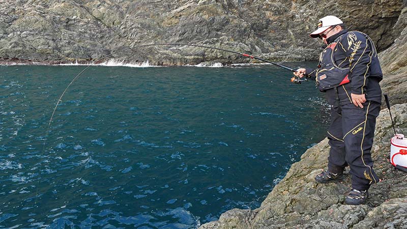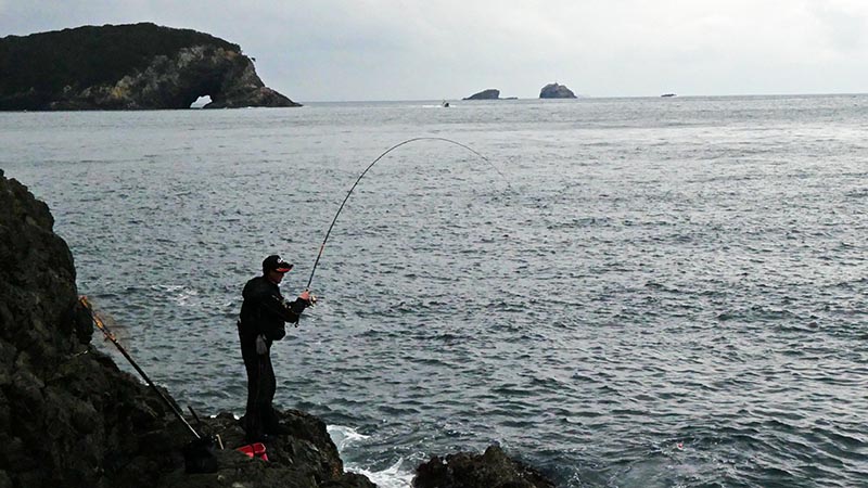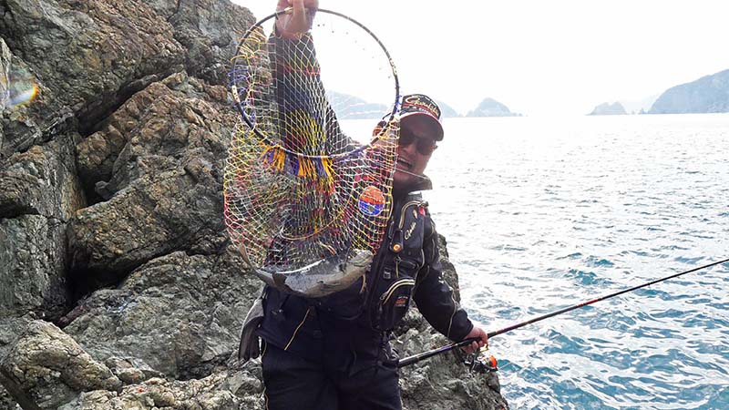 11時頃の瀬替わりは私だけ。“カイドク鼻裏”へ移動しました。釣果を聞くと佐藤君が良型を釣っており、裏から山越で表に行っての釣果だったらしい。中川君も私の目の前で35㎝前後のクロを釣ってくれました。
