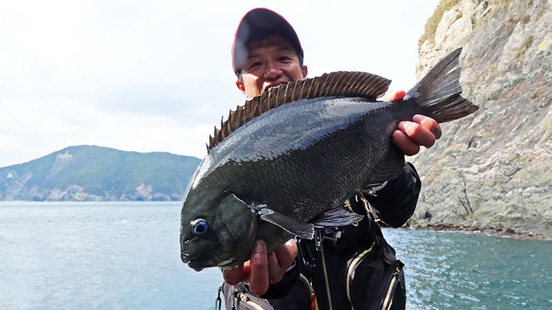 結局クロが釣れたのは“タチバナ横”方面で佐藤君が1匹、“スリオトシ”近くで竿を出した城本君が1匹の2枚だけ。あとは、アイゴや小型のイサキがポツンポツンと竿を曲げてくれる程度でした。