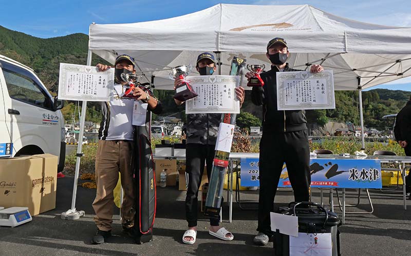 検量の結果、優勝は大きなヒブダイを釣って4.9キロの重量を稼いだ萩原さん。2位にはボラ・ブダイ・クロを仕留め4.38キロの私。同礁の上田さんもクロ・ブダイ・アイゴで4.2㎏となって4位入賞の快挙でした。