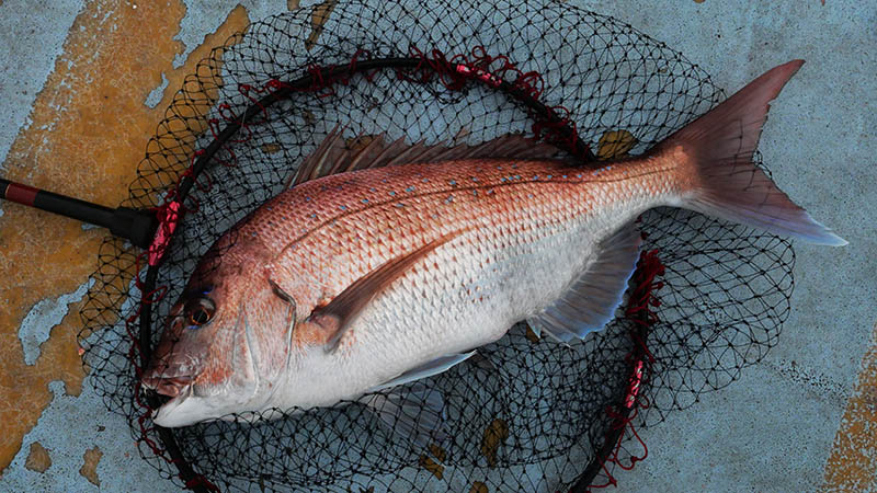 湾内の生簀は50㎝未満の小型マダイ。沖の生簀も小型が多く2㎏級が最大。