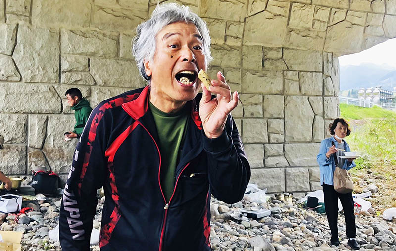 鮎用竹串作成中、お昼は蕎加から差し入れの弁当完食