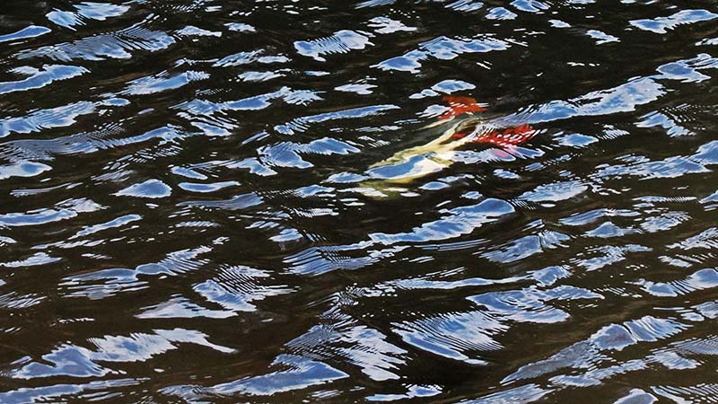 彼女はガン玉無しの仕掛けを深く入れる事が出来ないので、2Bのゴム張りガン玉を打つと何とか底まで入れられた。そのまま流してサシエが先端角まで届くと少し沈んでいるウキに変化、「聞いて・・聞いて」といっても意味の解らない彼女。