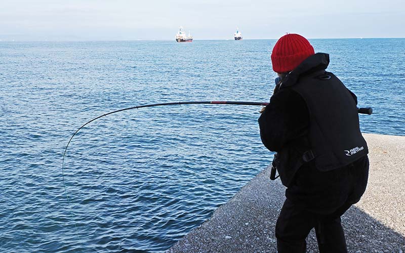 二人ともルアーが得意なので、私がマキエを打つ間はルアーフィッシング。30分ほど経ってチヌ仕掛けを出してカンダイがブチ切るか試したら、第一投で二ヒロ入った仕掛けにチヌが飛び付いて来た。これで試し釣りを終えて二人の出番。