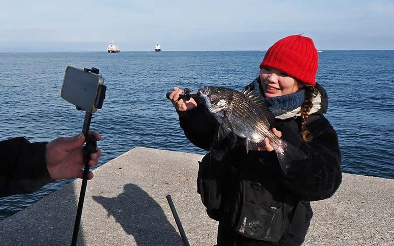 慣れていない二人には軽い仕掛けを沖に出さず、マキエと同調させて13mの底まで届けるには難し過ぎたかも知れませんが、最後には笑顔で納竿する事が出来ました。彼女も1枚欲しかったけど、次回の楽しみにとっておきましょう(^^♪