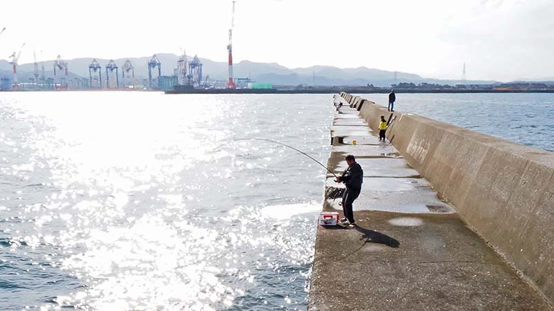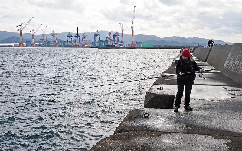 犬走りから別府方面の上げ潮と下げ潮は、通常より流れが速くてカンダイ釣りには向いていません。低い船着き場は北東からの波が返し波となって、波止際を釣るカンダイ釣りの仕掛けを沖に払い出して釣り難くさせていました。