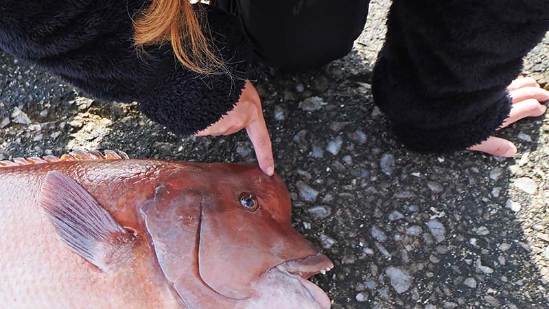 昼頃から仕掛けをもう一本出して、日高君は低い船付きで狙います。私が彼女のサポートをしていて、ふと日高君を見ると竿を大きく曲げており遂にカンダイがその雄姿を現しました。経験豊かな彼だから難なくゲット。
