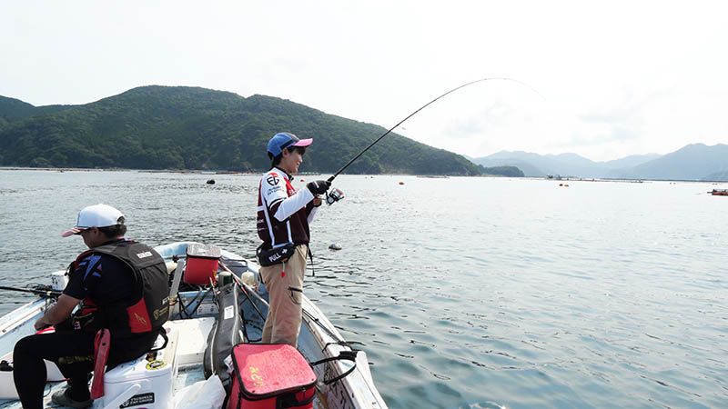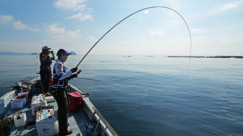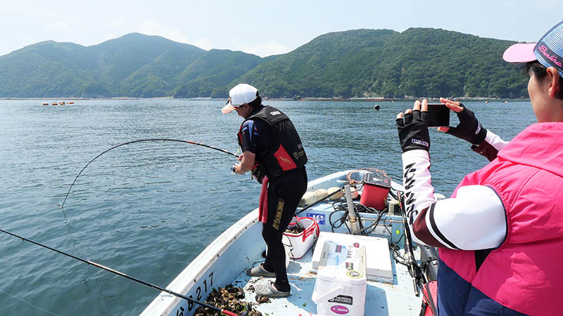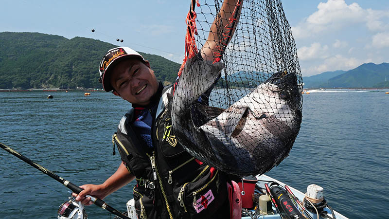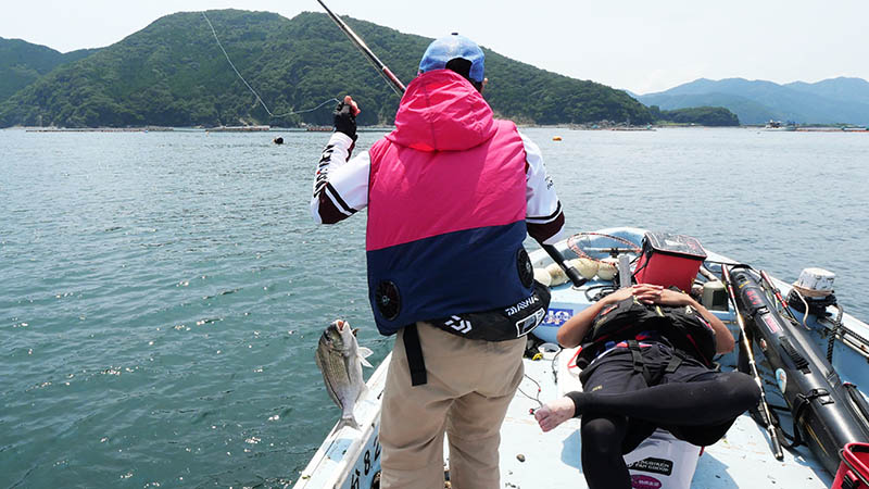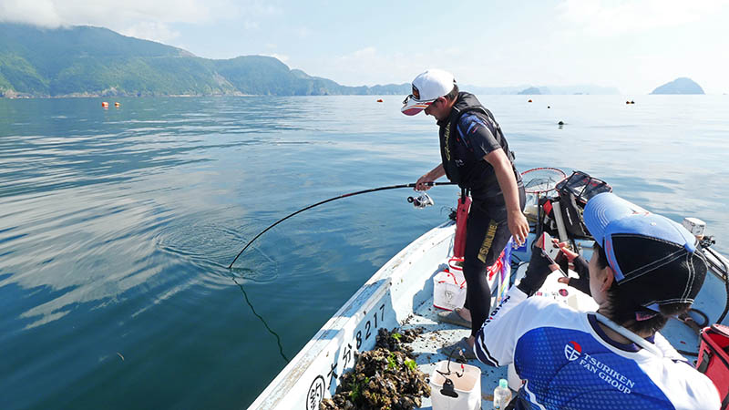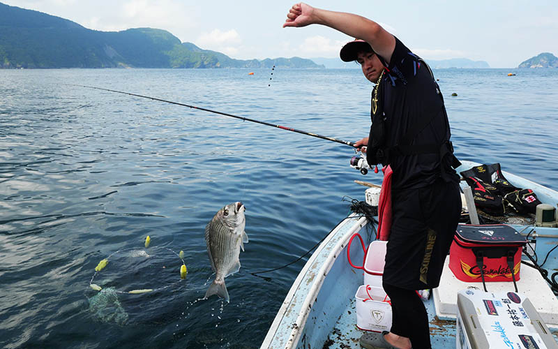 一投目からアタリは出るものの、ヘダイだったり掛からなかったり。30分以上過ぎた頃、フジモンの竿が大きく曲がり強い引きに耐えている。ハリ外れが無い事を祈りながらシャッターを切ると、浮いて来たのは紛れもない七本縞。