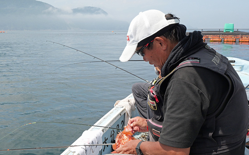 今日の蒲江の干潮は6時で満潮が12時頃。7時前に沖の生簀周りのブイに舫ったのが7時前、その時点で下げ潮が動いていて11時頃まで上げ潮は動いてくれない。11時を回ると上げ潮の流れが強くなり14時頃迄続く。その後緩やかな潮が16時の納竿まで続くという、干満の潮時に関係のない潮の動きは初めてです。