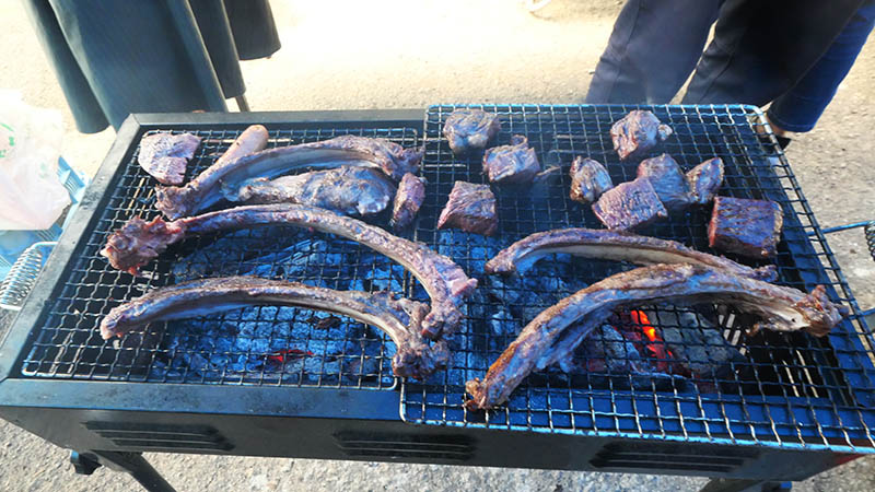 昼は実家近くの弟の敷地内で焼肉会、猪のスペアリブの食べ方指南中・・