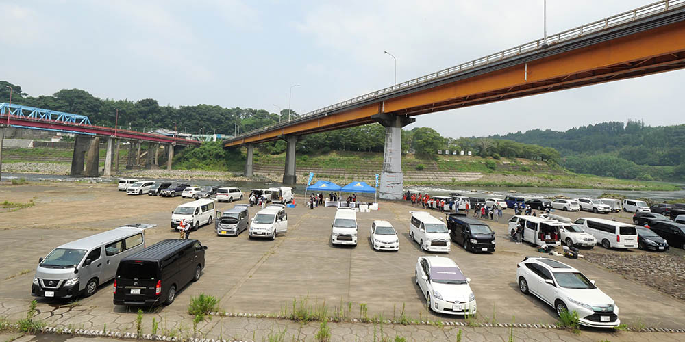 大会前日から、囮鮎の入った生簀を大会会場近くの川に浸け、一晩中監視するスタッフ。夜明け前に他のスタッフも集合して、3ブロックの鮎を小分け。