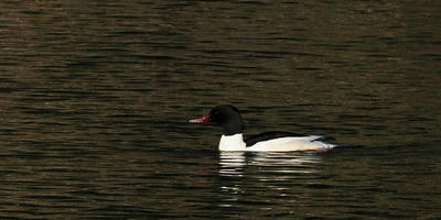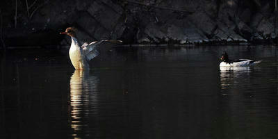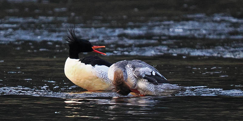 夜明けと共に下流から相次いでカワアイサが飛来、合計14羽が通過。