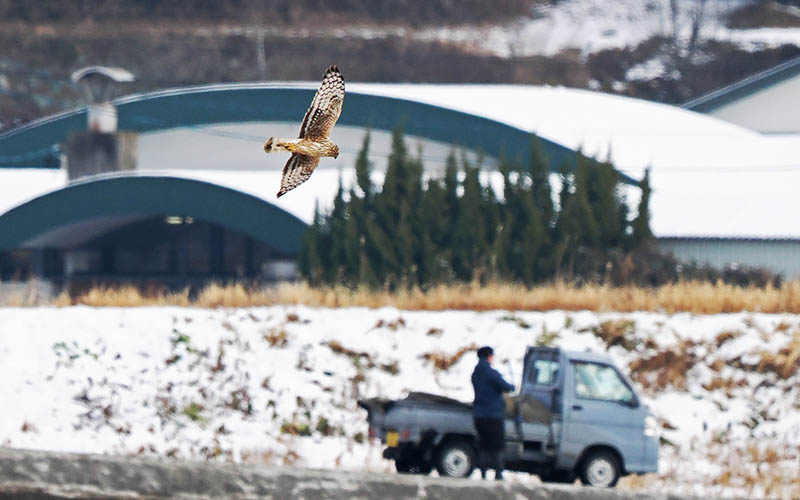 既に一台の車が止まっており、吹雪の中でコミミズクを待つけど出ない。
