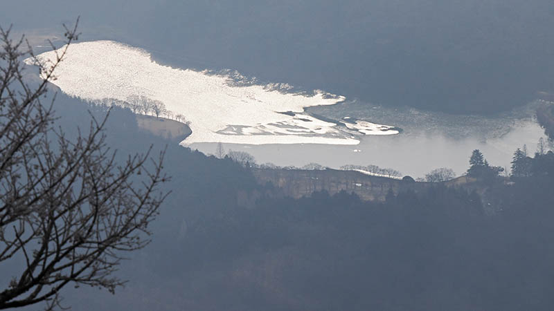 眼下に半分凍結した志高湖(オートキャンプが人気)