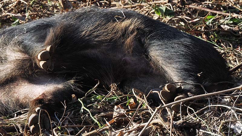 山中で出会った猟師さんに声を掛けた。すると傍には絞められて横になっている猪。括り罠で捕獲し、これから写真撮影をして車に積む所でした。