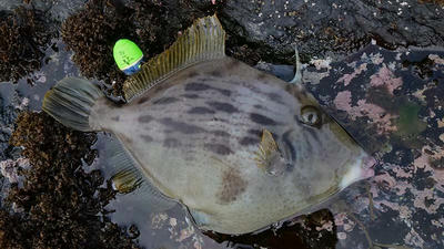 150カウント(多分8~10m位のタナ)を重点的に狙って、ハリ外れが2回、カワハギが1匹、マダイの仔が1匹、タイノエが1匹の釣果。足元を狙うと案の定カンダイに2回も飛ばされ、後半は船付け方向で狙うもクロボウズで終了。