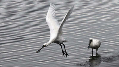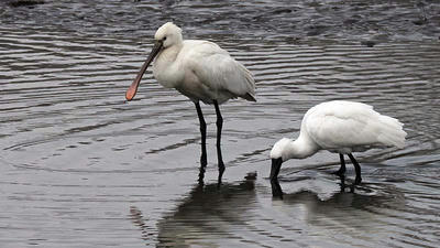 左がヘラサギ、右はクロツラヘラサギ