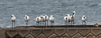 15羽のクロツラヘラサギと右を向いたヘラサギ1羽