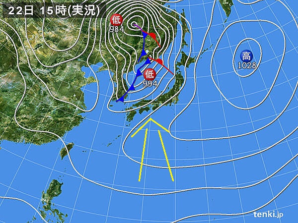 15時の実況天気図を添付していますが、22日は南からのウネリが大きくなり、大分県などは春一番が吹きました。そのウネリは続き、23日の5時頃から北西風が強まり、ウネリは収まる方向ですが、選手は終日北西風に晒されました。