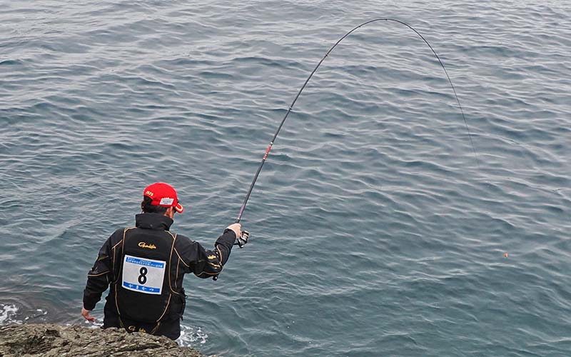 決勝戦で竿を曲げる那賀選手は11枚の釣果