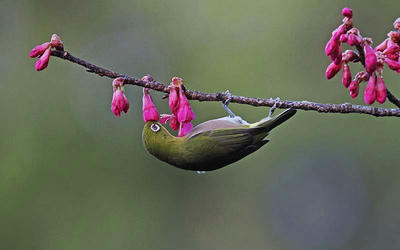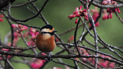 寒緋桜も蕾と勘違いするけど咲いていて、ヤマガラやメジロが来ている。
