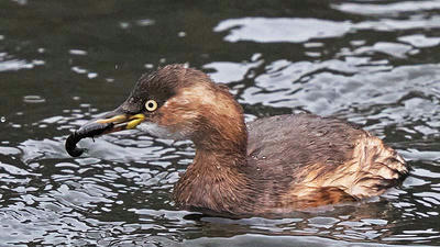 素潜り漁が得意なカイツブリがクロカワムシをゲット